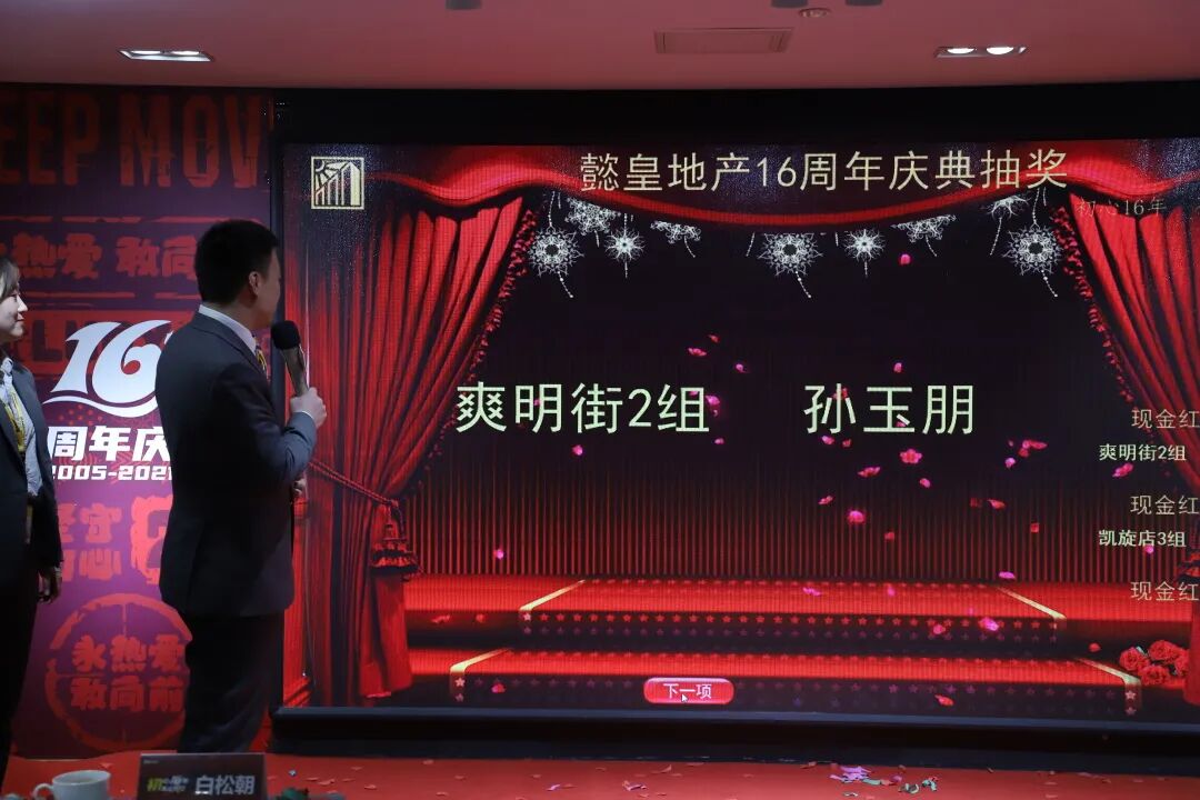 懿皇地產(chǎn)創(chuàng )始人白松朝先生上臺致辭,他首先講述了懿皇地產(chǎn)從一家店面發(fā)展到現如今的歷程和感悟,同時(shí)也對曾經(jīng)在懿皇奮斗過(guò)的全體伙伴和服務(wù)過(guò)的每一位顧客表示深深的感謝,感謝大家包容懿皇的成長(cháng)。拓耕不止十六載,征途向前見(jiàn)未來(lái),長(cháng)江后浪推前浪,一浪更比一代強,白總也相信懿皇是一個(gè)有所付出就有所收獲的平臺,在這里愿更多的后起之秀脫穎而出,共同譜寫(xiě)懿皇新的篇章。
